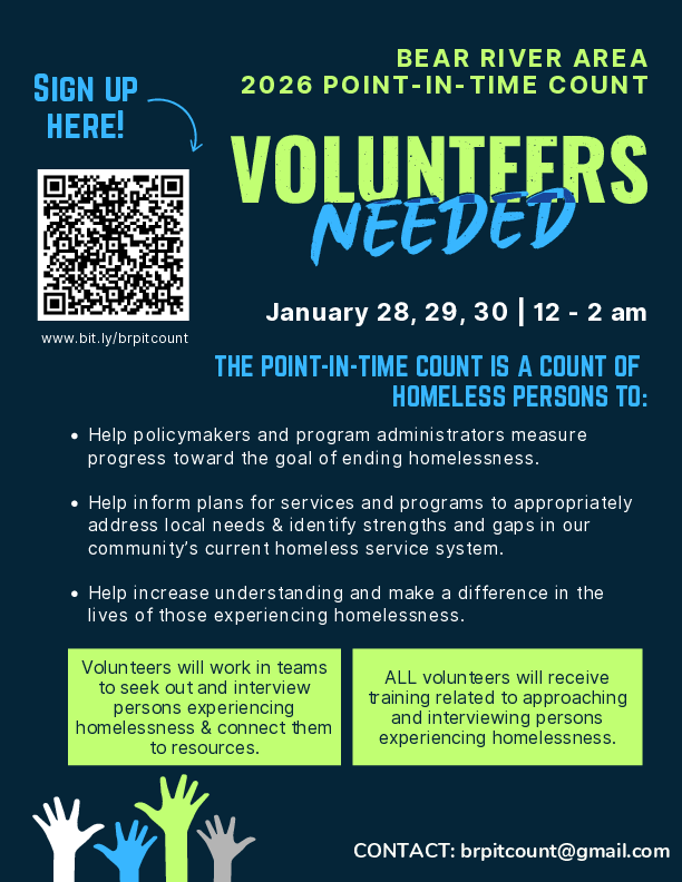 - Jan 28-30, 12-2am: Volunteers needed for the annual Bear River area point-in-time count of homeless persons. Sign up here, details below.
