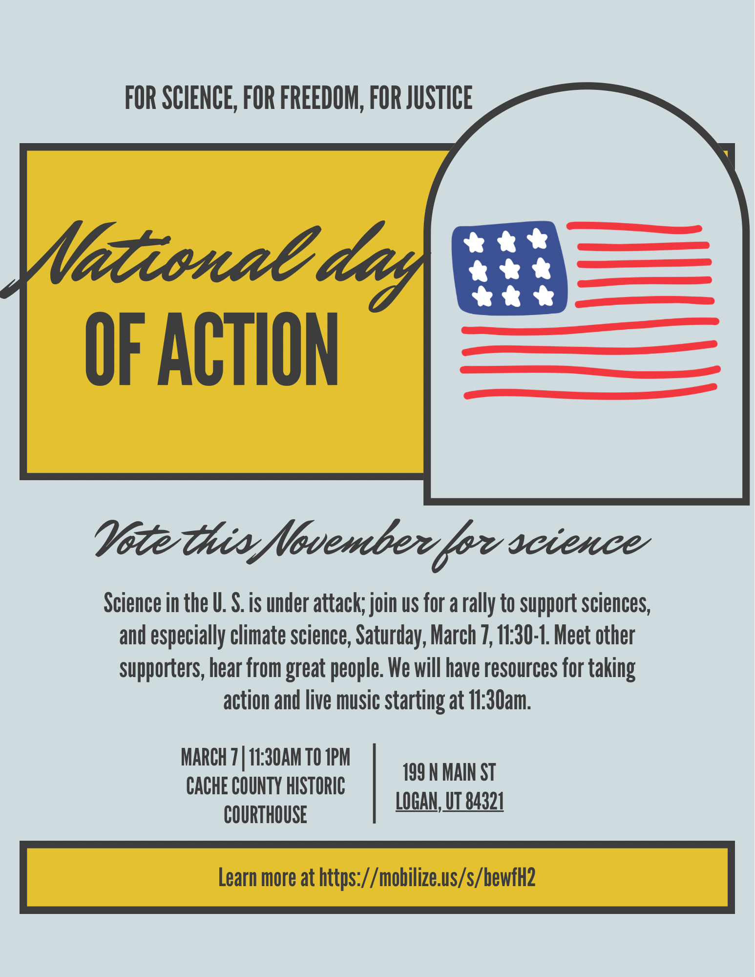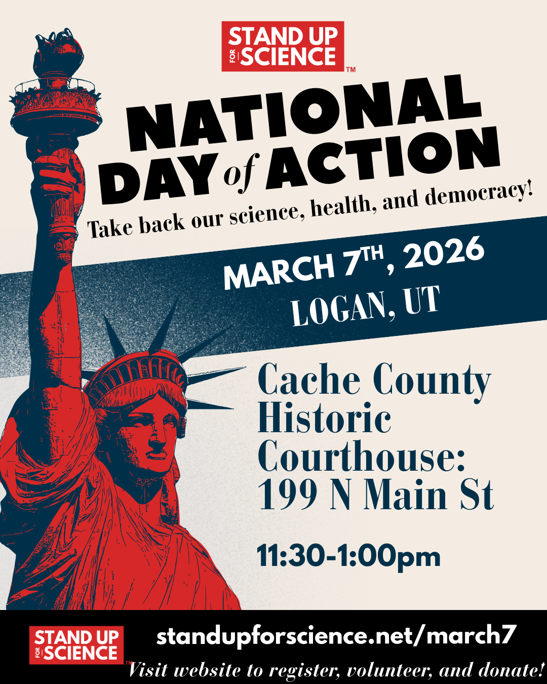 - Mar 7, 12-1pm: StandUpForScience Day of Action Rally @ Cache Courthouse; flyers below