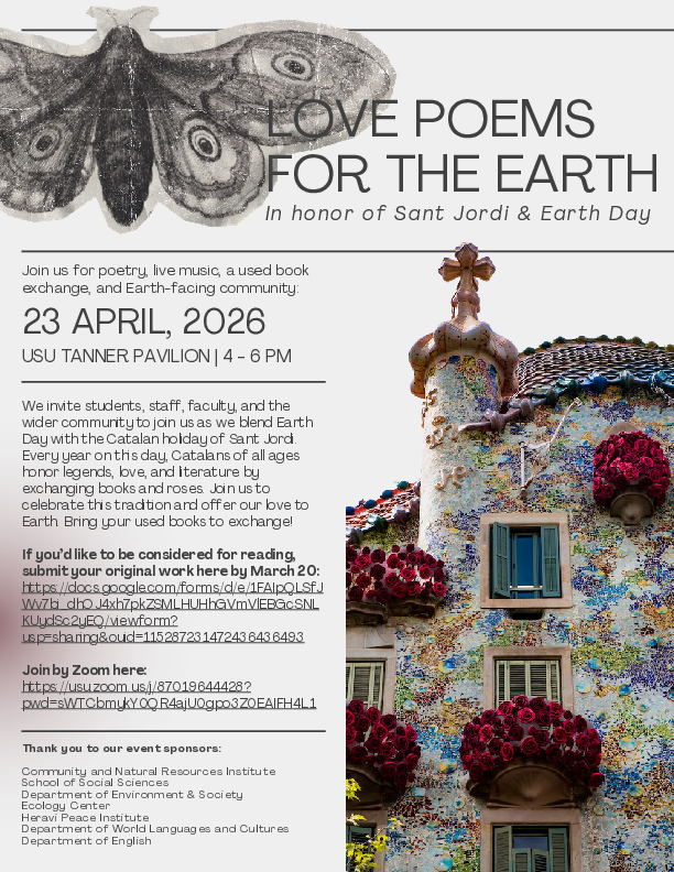 - Apr 23, 4-6pm: Love Poems for the Earth @ USU Tanner Pavilion; see flyer below for details